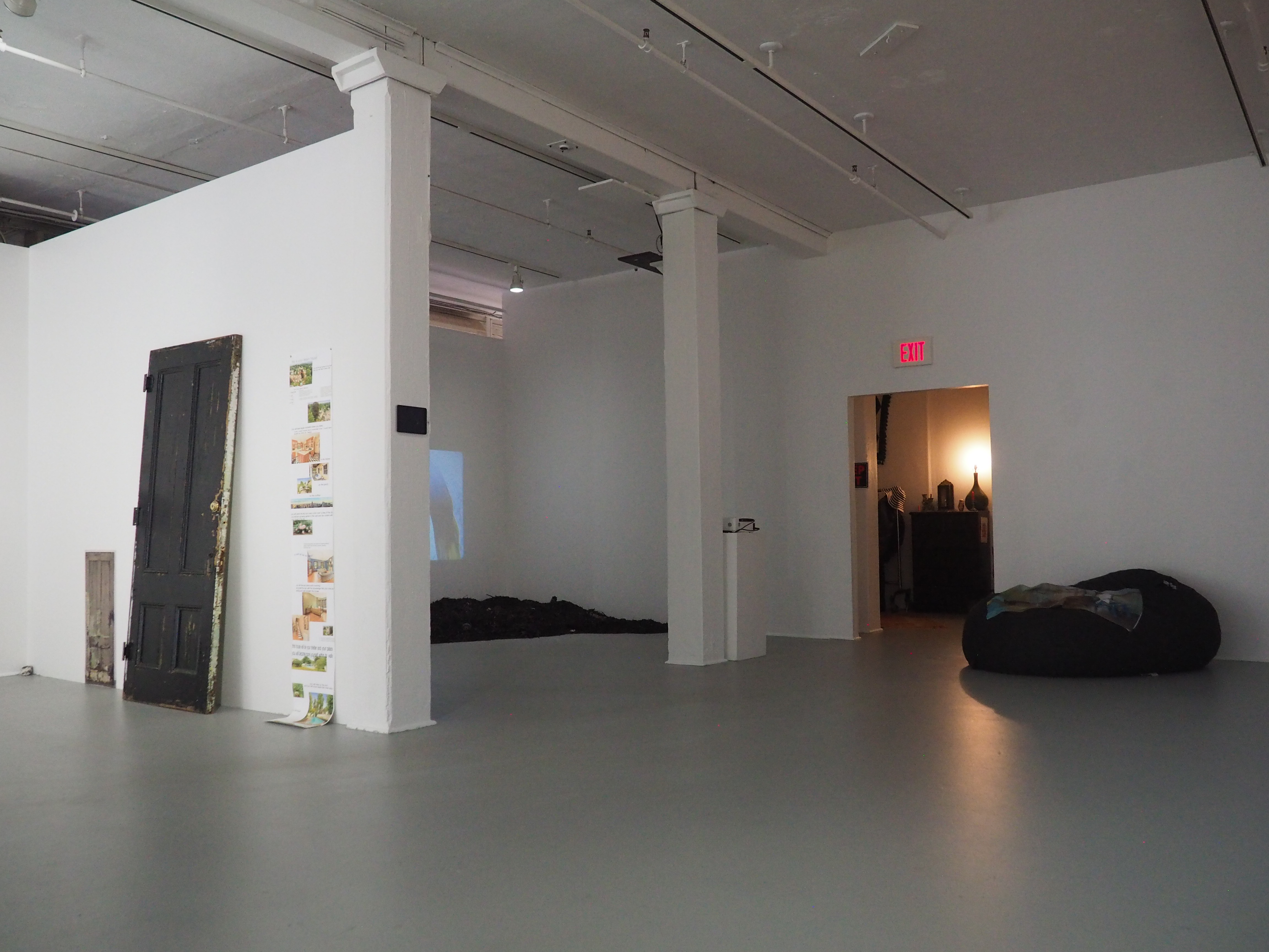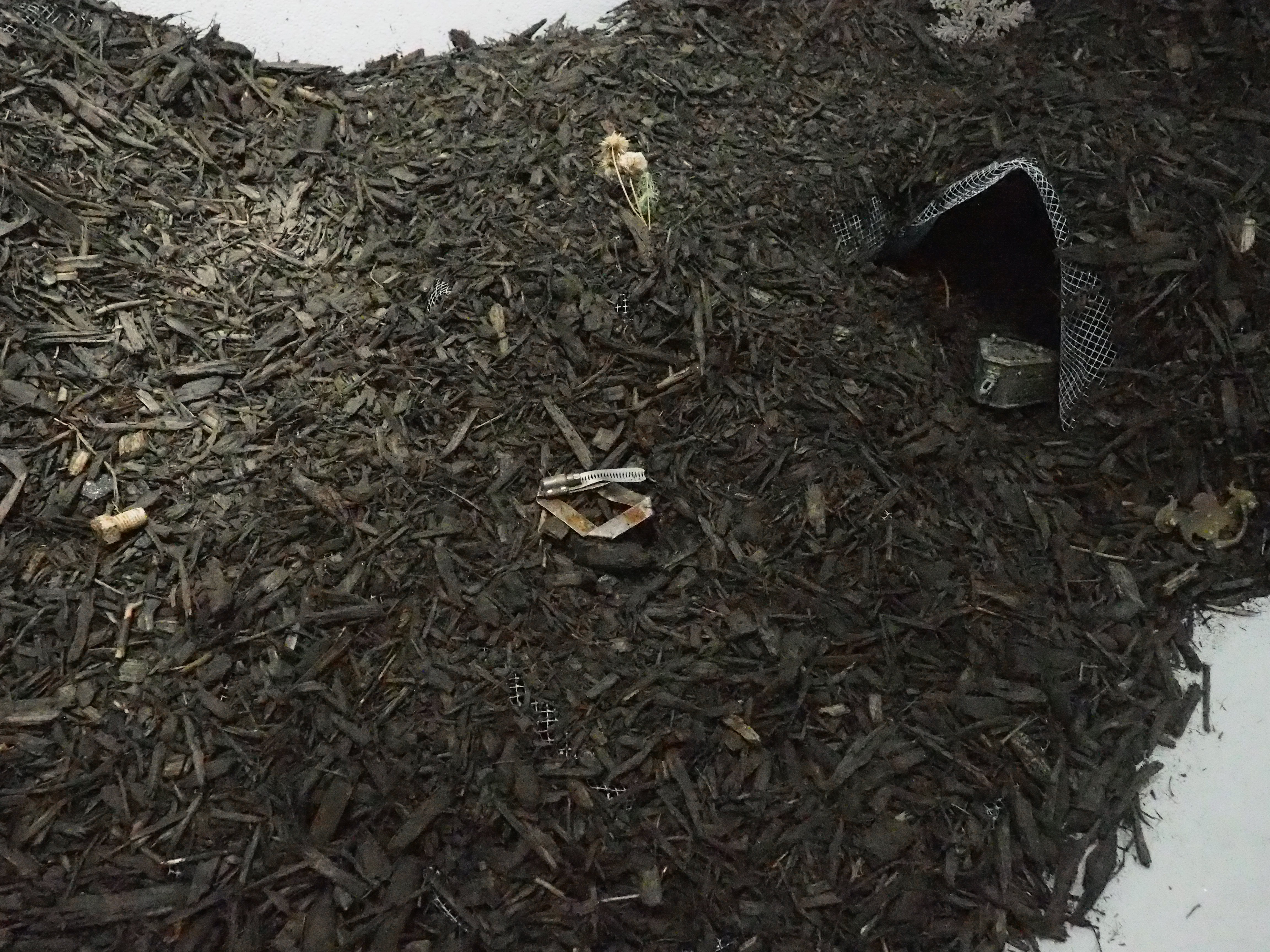 PLEASE LET ME IN is a multimedia installation of video, photo, and object work that crystallizes as an interactive experience, urging gallery-goers to excavate and co-create the exhibition’s narrative. A living bedroom installed deep in the gallery is an open invitation to explore an unknown stranger’s most intimate space—an opportunity to discover details hidden within the work and to reckon with what those discoveries might reveal. Beyond the bedroom emanates the detritus of fantasy and nightmares—large scale projections of warped home interiors immerse you in the realm of the Other; found object creations imbue the space with a sense of haunted history; fairy houses made of scavenged bits of earth and trash evidence an idyllic fairytale in a state of apocalypse.